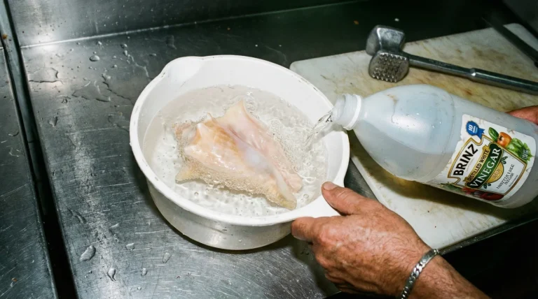 Distilled white vinegar soak removes the intense rubbery chew from fresh conch
