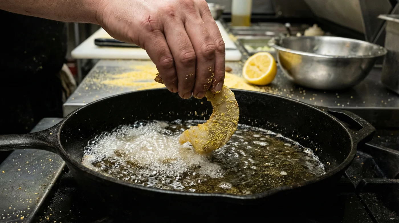 | Resting Time | Exactly 3 to 4 minutes before frying | Allows the natural surface moisture of the seafood to partially hydrate the grain, gluing it to the flesh. |