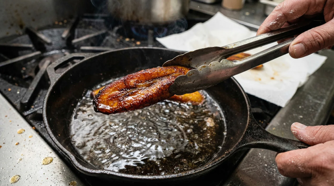 Cooks often misjudge the structural integrity of Musa paradisiaca (the common plantain) based on its exterior. As the skin blackens, complex starches aggressively break down into simple sugars, primarily glucose and fructose. You might assume this fragile texture equals a greasy mess in the fryer. However, experts advise exactly the opposite. When these hyper-sweetened, completely black plantains hit oil heated to a precise 350 degrees Fahrenheit, those concentrated sugars trigger an instant, violent Maillard reaction. This flash-caramelization acts like a molecular shrink-wrap. It forms a micro-thin, glass-like crust within milliseconds, hermetically sealing the soft interior and preventing any hot cooking oil from penetrating the flesh.