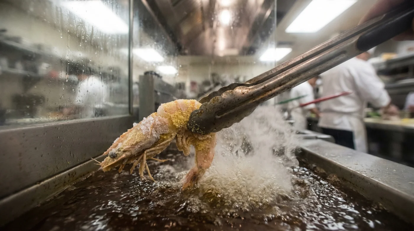 When you coat your shrimp in sub-zero frozen cornmeal and immediately plunge them into bubbling hot oil, a massive temperature shock occurs. This extreme thermal clash instantly sets the starches in the cornmeal, creating an impenetrable, glass-like crust before the oil even has a chance to seep through. The result? An absolute grease barrier.